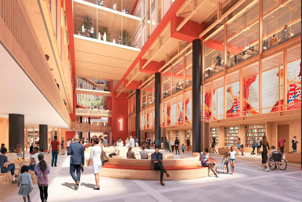 Rendering of the lobby of the British Library Extension © RSHP Architects